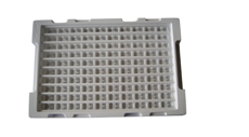 Parts are placed in individual cell. Vacuum tray available for manual packaging and injection molded tray for automation process.